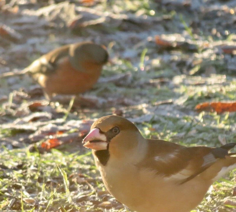Hawfinches are striking birds. As the name suggests Hawthorn stone kernels form part of the diet. They are also known for being partial to the kernels of cherry stones. The scientific name Coccothraustes coccothraustes comes from Greek and means ‘seed-breaker’ (or I suppose ‘seed-breaker seed-breaker’, leaving us in no doubt about the fact that it breaks seeds). I read that the bill can exert over 50 kg of crushing force. I’ve lost count of how many times I quoted that fact to anyone who will listen. I just find it impressively cool.