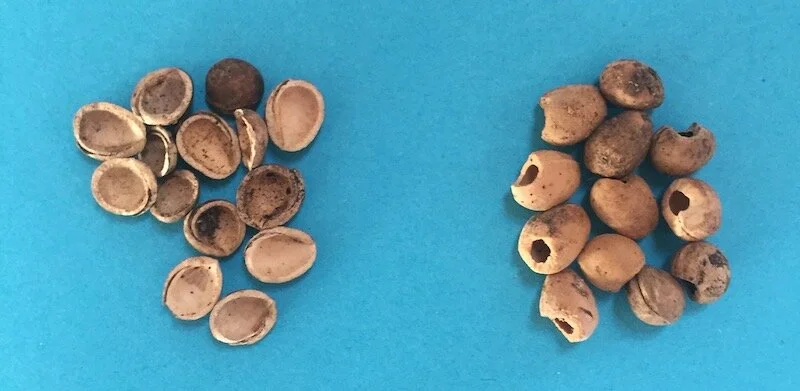 Left: Cherry stones split by a Hawfinch using over 50kg of crushing force (did I already mention that?). Right: Stones gnawed open by a Bank Vole.